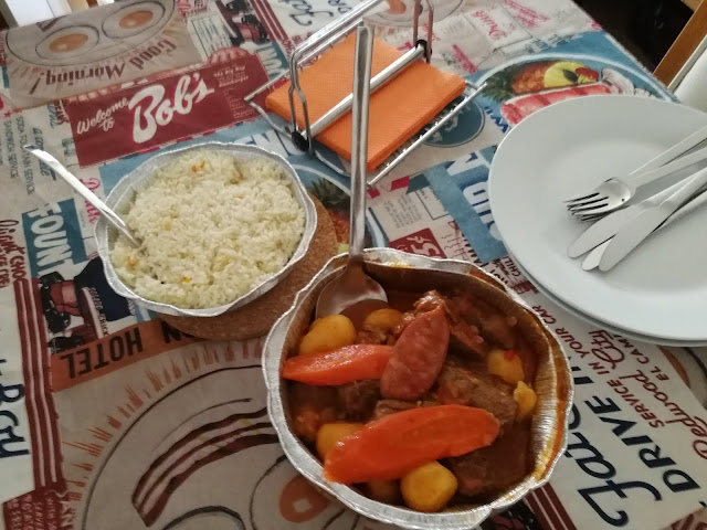 Tämä ruoka oli mun ehdoton suosikki koko reissulla. Haettiin kotiin ruokaa paikasta, mikä näytti samalta kuin monet grillikioskit Suomessa. Mutta ei siellä myyty mitään roskaruokaa vaan ihan tavallista kotiruokaa. Menu oli portugaliksi ja pyysin Soníaa valitsemaan mitä tahansa, mikä on hyvää. Vitela à Lafões on vasikkaa, joka oli haudutettu niin mureaksi, että liha melkein hajosi suuhun. Se oli tomaattikastikkeessa porkkanan ja pikkuperunoiden kanssa. Lisukkeena meillä oli vielä riisiä. Satsi, josta kolme henkilöä sai vatsan täyteen ja siitä jäi vielä ylikin, kustansi 10€.