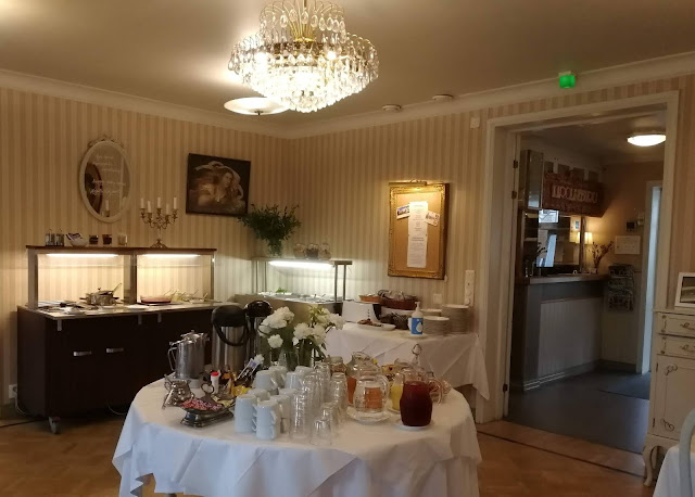 Olimme varanneet itsellemme perhesviitin, mutta vahingossa se oli tuplabookattu. Pääsimme sitten samalla hinnalla kartanon parhaimpaan huoneeseen, Karolinasviittiin. Tuntui, että olisimme tulleet luksus -mummolaan. Niin huoneessa kuin rakennuksessa oli ihana, vanha tuoksu. Huonekalut olivat tyylikkäät. Uutta olivat vain patjat sängyissä ja taulutelevisiot molemmissa makuuhuoneissa.